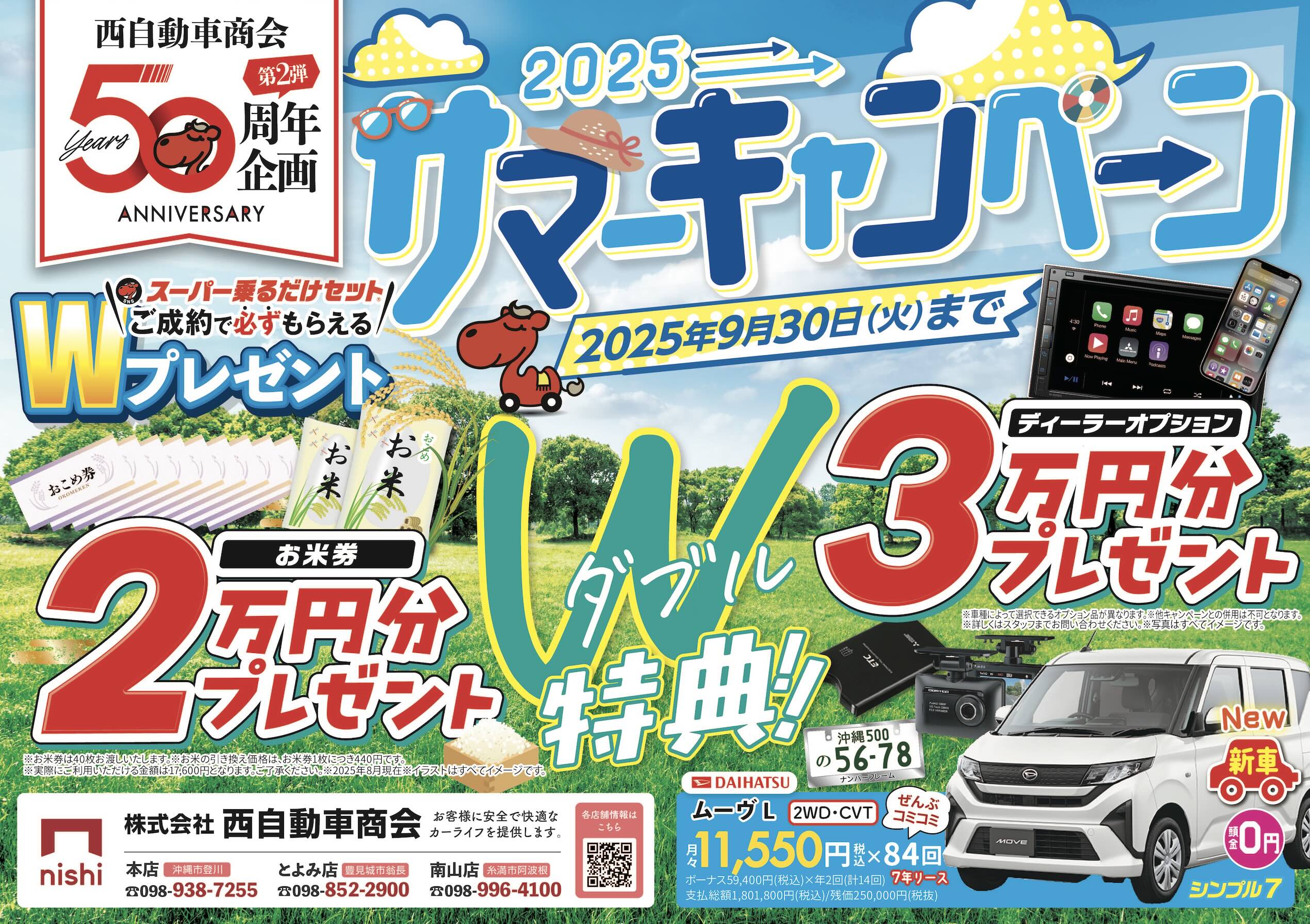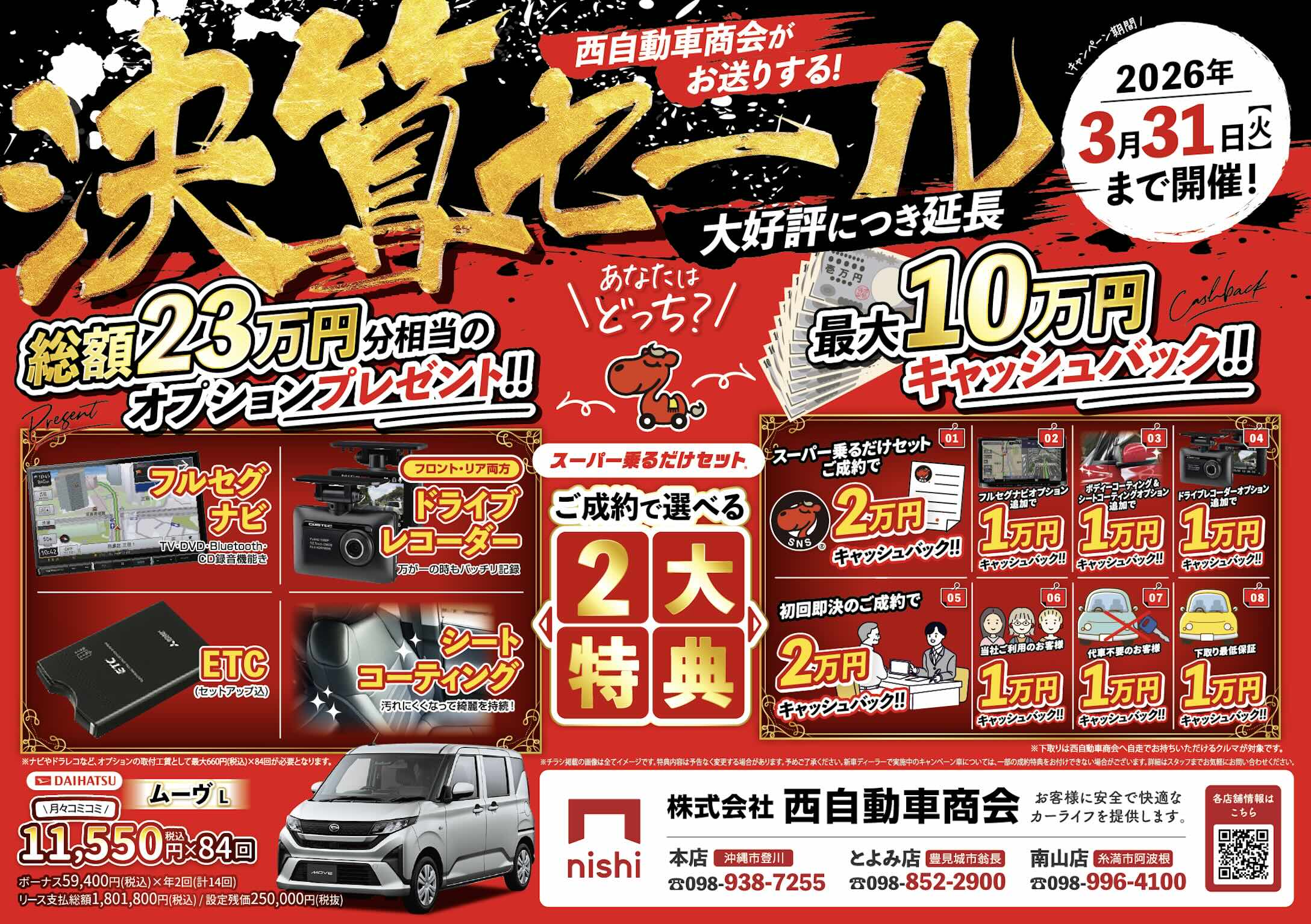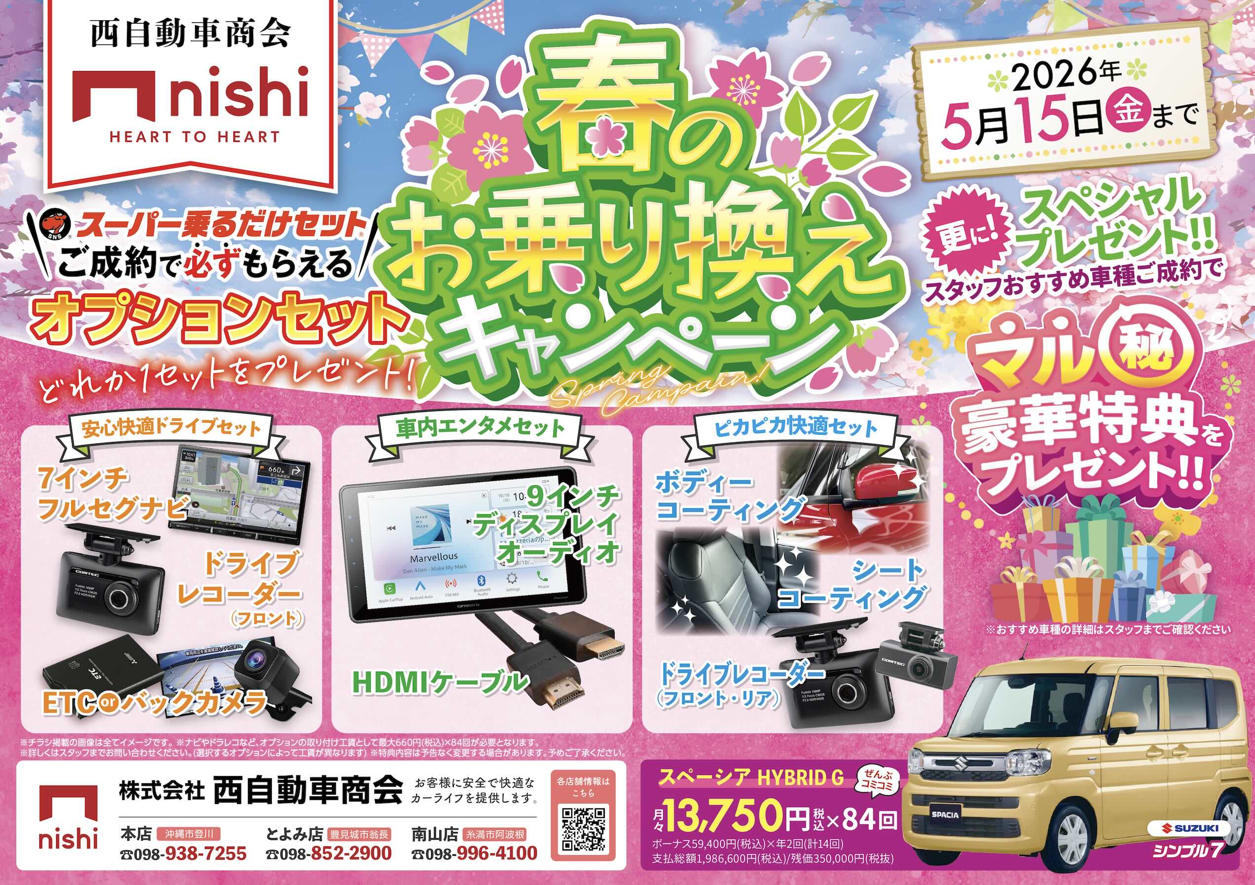 初めは購入など考えておらず、気になっていたので、説明だけ聞こうと来店しました。話を聞いていくうちに、乗るだけセットの魅力を感じ、契約をすることに決めました。また、担当者の方や保険部の方の説明がとてもわかりやすく、店内の雰囲気、気遣いが素晴らしいと思いました。西自動車商会さんを選んで良かったです。