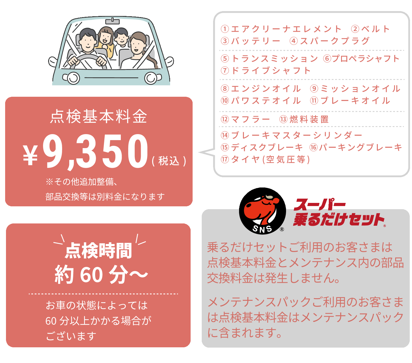 西自動車商会で行っている点検内容と料金は下記になります、ご予約をお待ちしております。