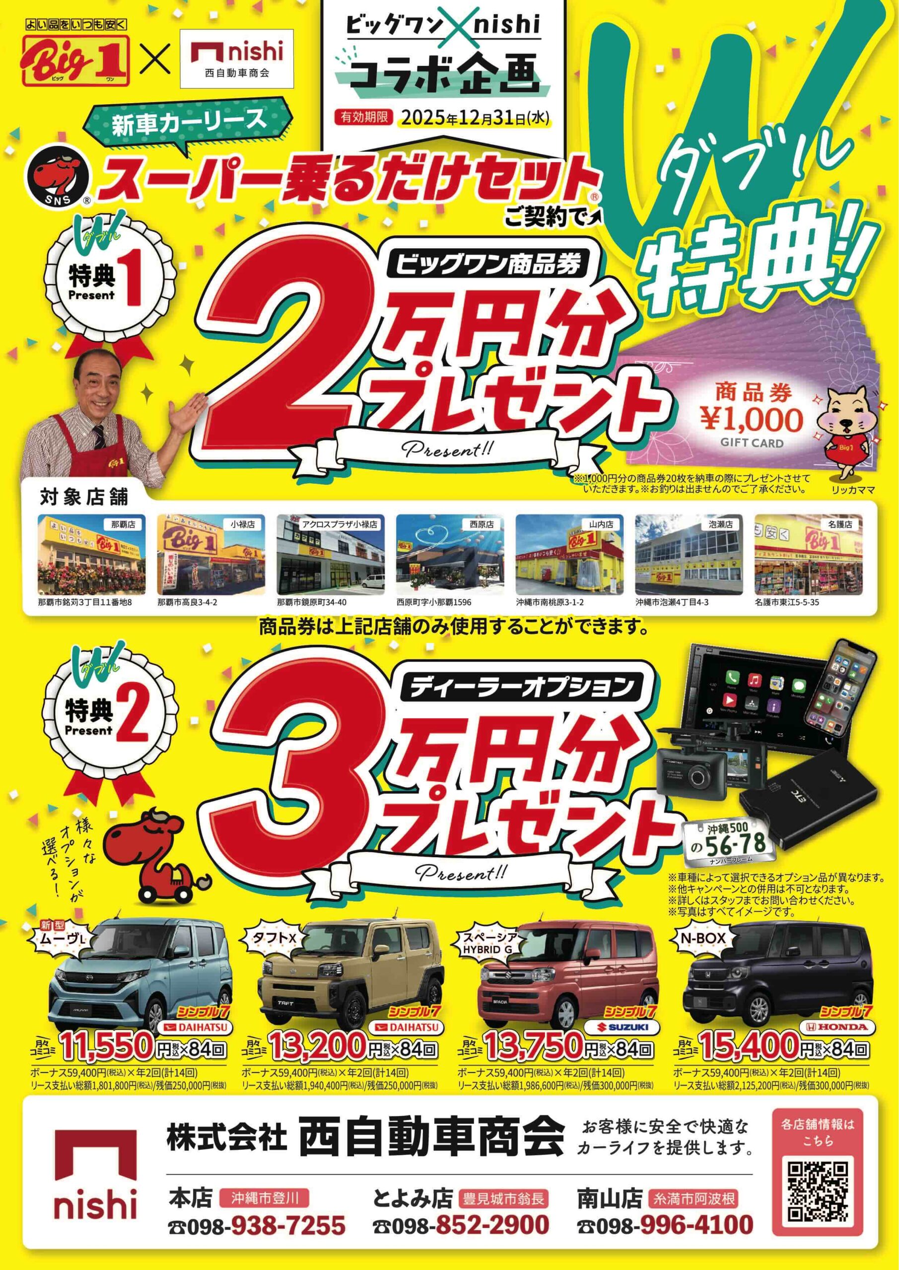 ビッグワン対象店舗に設置されているコラボチラシをご持参の上、西自動車商会にお越しいただき、スーパー乗るだけセットをご成約いただくと、豪華特典をプレゼントいたします!