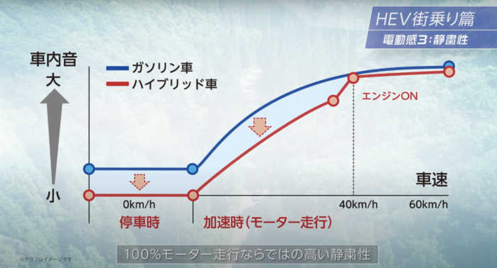 街中で走行する時の低速域では、エンジンを駆動せず充電したバッテリーだけで走行します。
