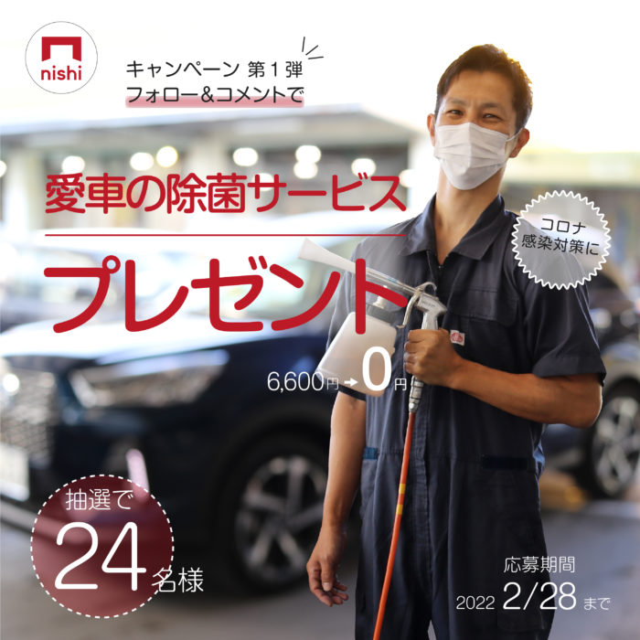 それに伴いアカウントフォロー&コメントしていただいた方の中から、抽選で24名様に[愛車の除菌サービス]をプレゼントしております。