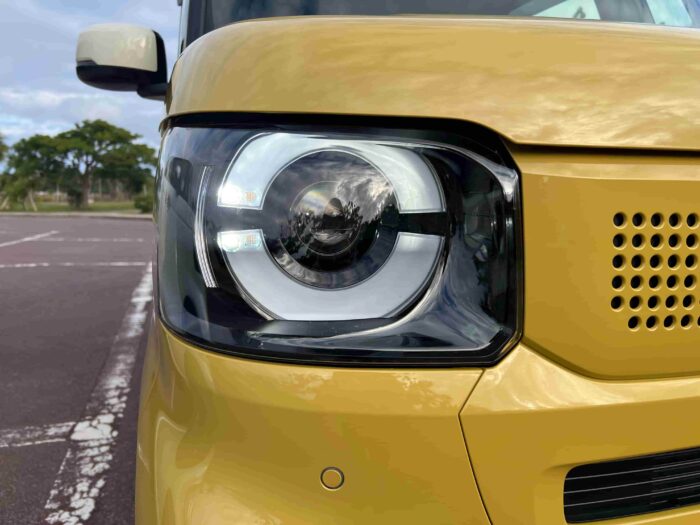 N-BOXは、シンプルなデザインの中にフロントグリルの丸穴デザインや丸目ヘッドライトを装着することで親しみやすさを表現しました。