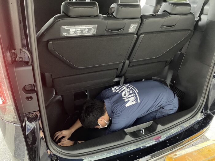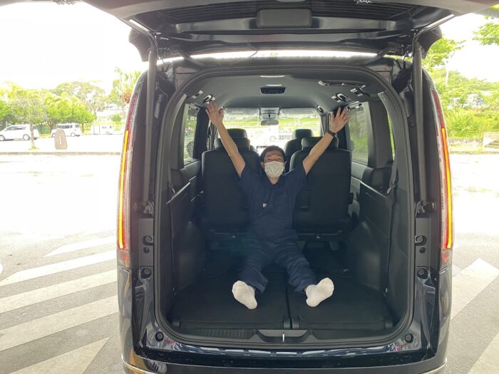 3列目のシートを倒すとあっという間に荷室が拡大します。3列目のシートを倒さない状態でも男性1人が入る広さがありますよ。