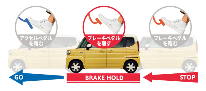 信号待ちや渋滞時の停車中でも足が疲れにくく便利な機能です。