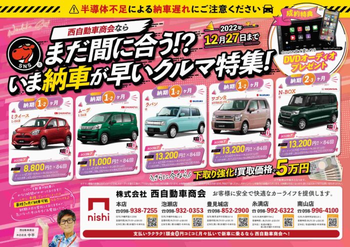 いま納車が早いクルマ特集!! 西自動車商会ならまだ間に合うかも!