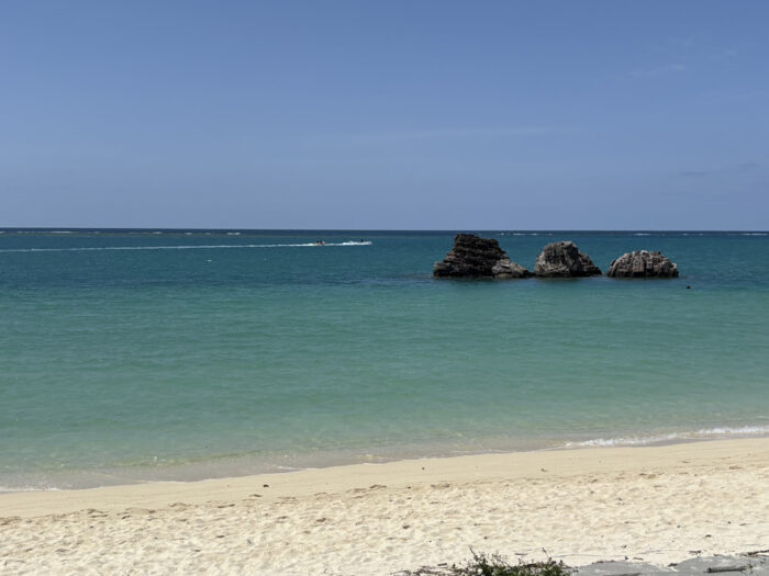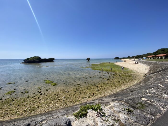 渡具知(とぐち)ビーチは遠浅になっているため、干潮時には沖のほうまで歩いて行くことができます。