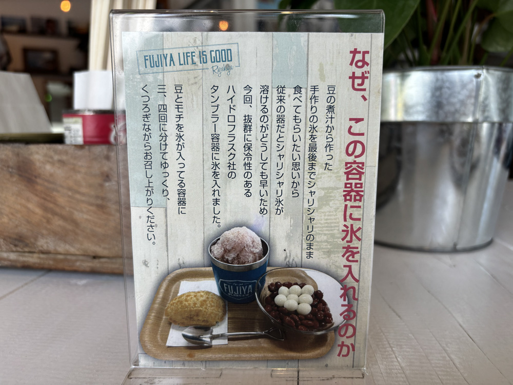 真っ白な氷の下には、甘く煮込まれた金時豆がたっぷりで、シンプルで飾らない見た目はまさに“ザ・沖縄ぜんざい”。