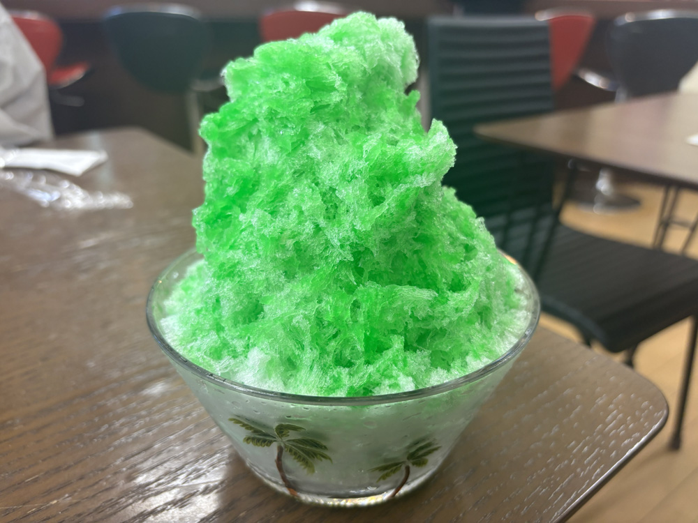 今回いただいたのは、メロンシロップがたっぷりとかかったかき氷。