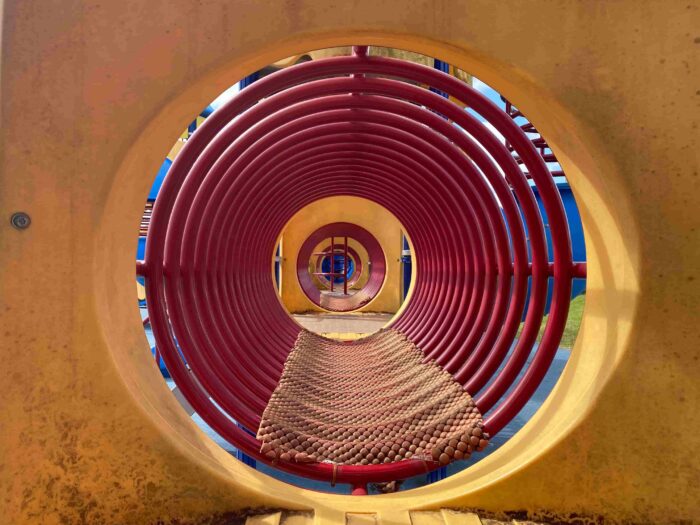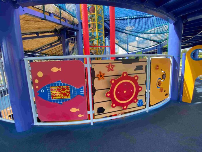 遠くの景色が見える双眼鏡など、全43のアイテムが楽しめる大型遊具です。