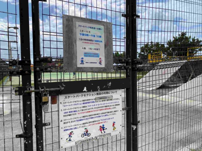 バスケットコート、テニスコート、スケートパークは管理事務所にて受付が必要