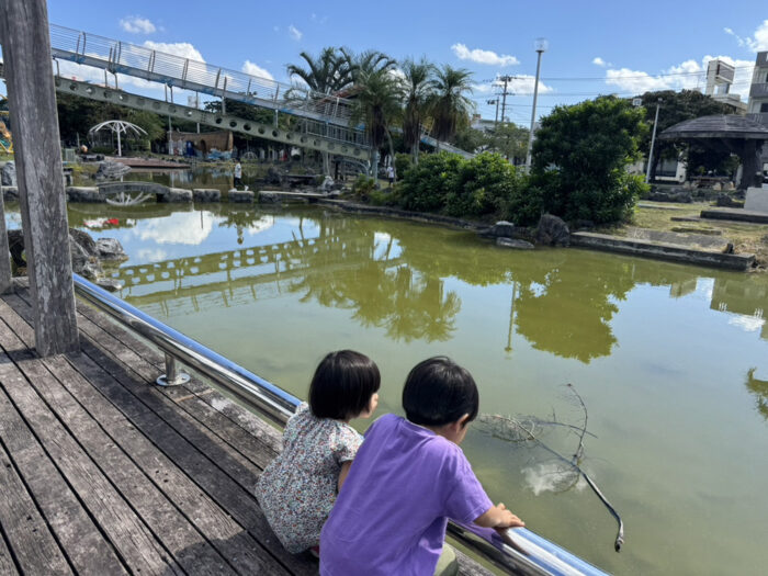 お世辞にもきれいとは言えませんが、アメンボや小魚が泳いでいて、男の子たちは楽しそうに観察していました。
