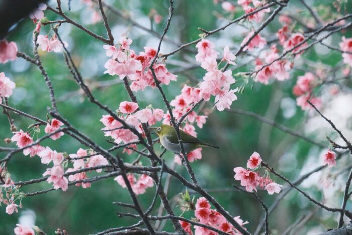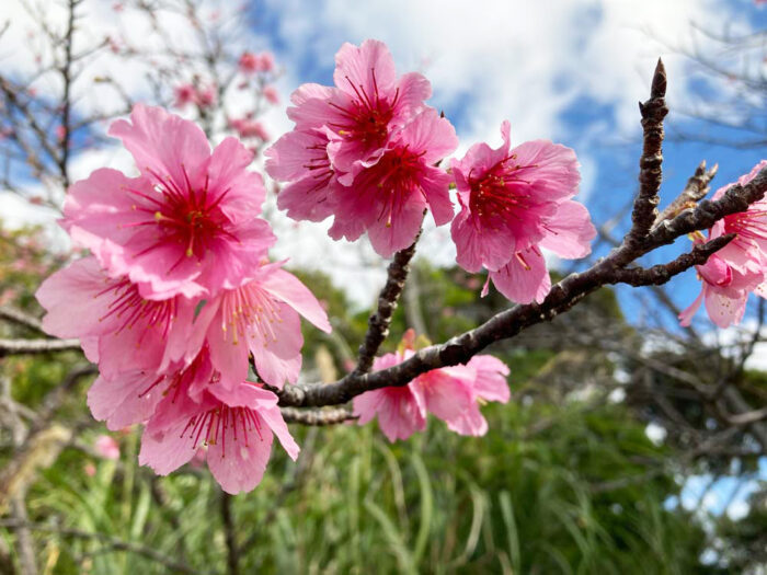 日本一早い開花で知られているヒカンザクラは、鮮やかな濃いピンクの花で沖縄のいたる所で見ることができます。