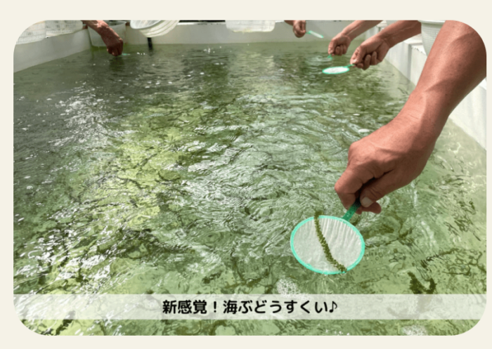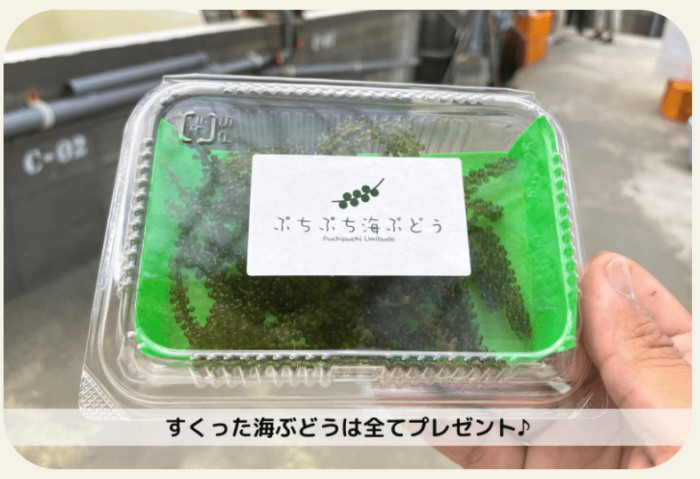 海ん道さんの施設内の養殖場では海ぶどうのつみとり体験や養殖場見学だけでなくすくった分だけお持ち帰りできる「海ぶどうすくい」も一緒にお楽しみいただけます。