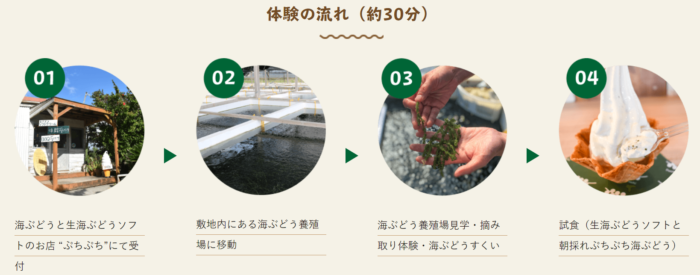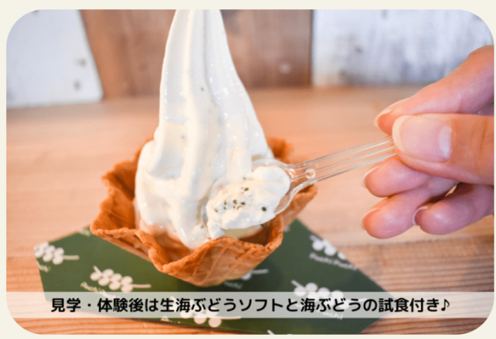 また、体験・見学には生海ぶどうソフトと朝採れぷちぷち海ぶどうの試食が付いており海ぶどうを存分にお楽しみいただけるそうです!海ぶどうソフトは味の想像ができないので挑戦してみたいです!