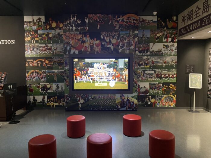 2階は有料ゾーン( 展示・体験コーナー)となっておりエイサーで使われる道具の展示や音楽の紹介のほか、エイサーの演舞映像を見たり、エイサーの音楽に合わせて太鼓を叩いたり踊ったりできる体験コーナーもあります。また、エイサーをより深く知ってもらうためのエイサーアーカイブコーナーもあります。