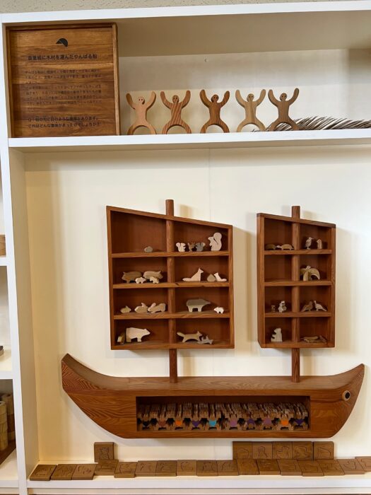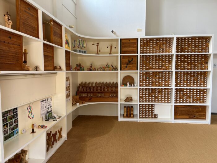 やんばる森のおもちゃ美術館の中にはイタジイや琉球松などやんばるの森で育った木で作ったおもちゃが多数あります。
