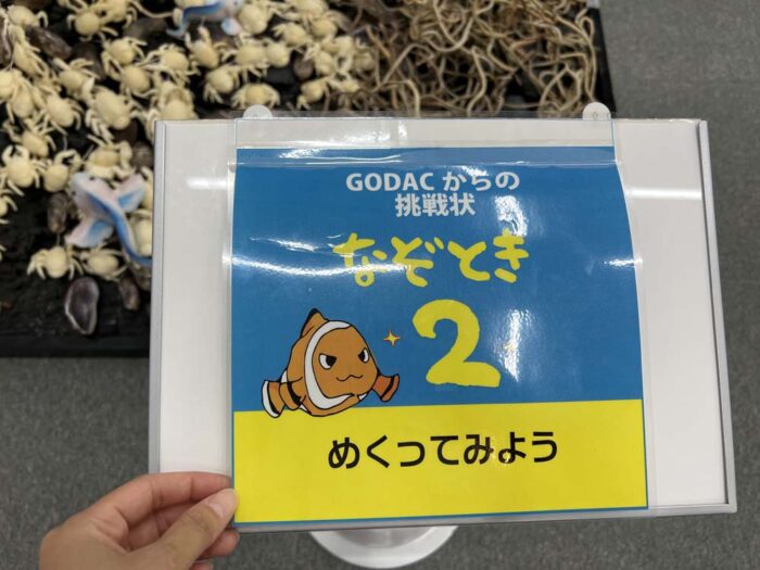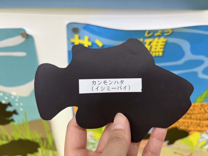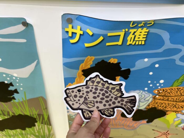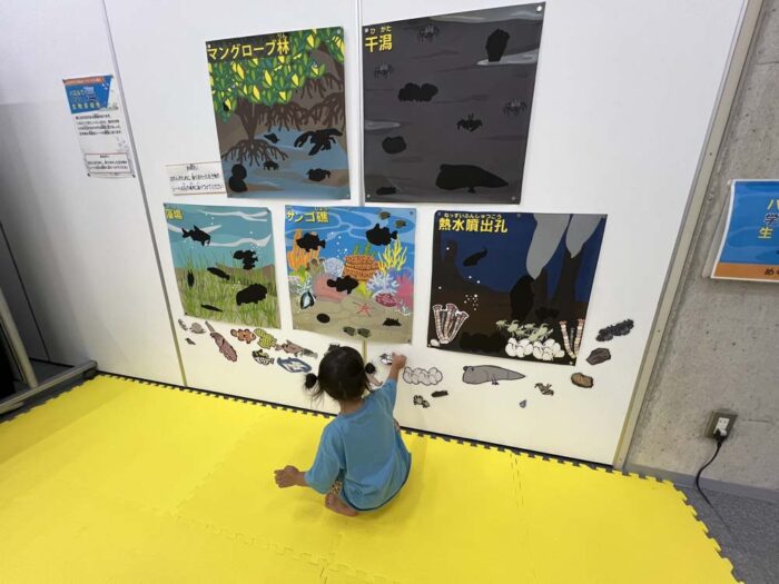こちらはは黒い影と同じ生き物を探して貼るという、マグネットで遊びながら海の生き物を学ぶコーナーでした。