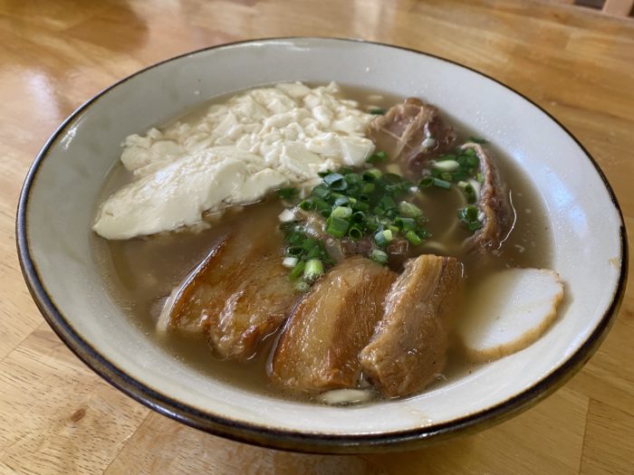ゆし豆腐、軟骨ソーキ、三枚肉、かまぼこ、ネギが上に乗っていますが、