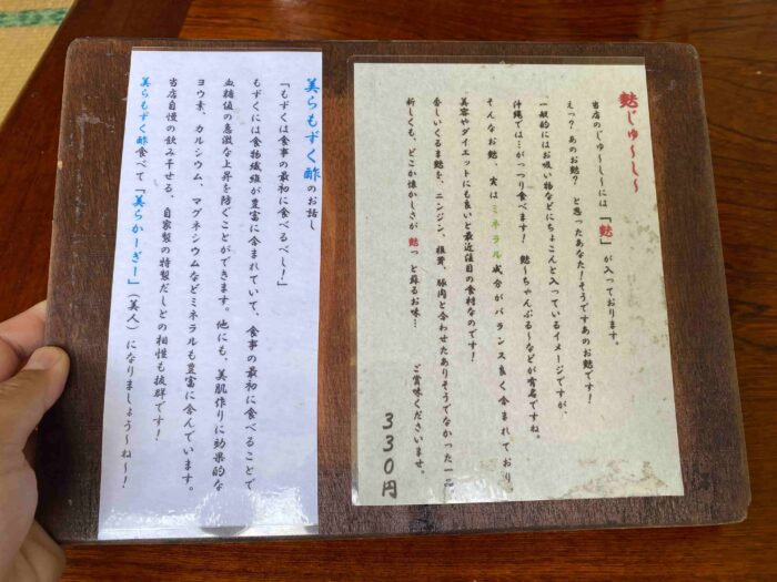 料理を待っている間に、ジューシーや付け合わせのもずくなどの説明書きを見たらワクワク倍増!