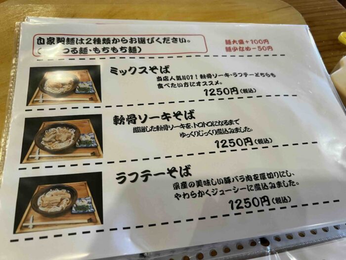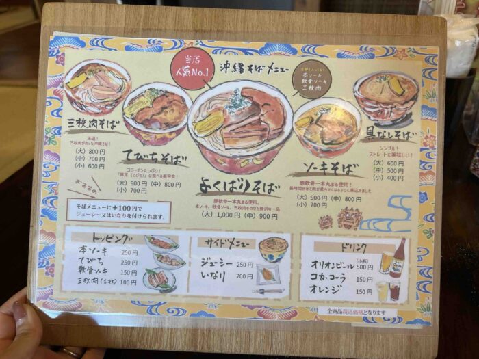人気No.1のよくばりそばを筆頭に、定番の三枚肉そば、ソーキそば、てびちそばなどから選べます。