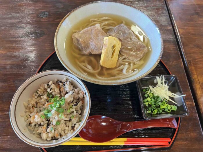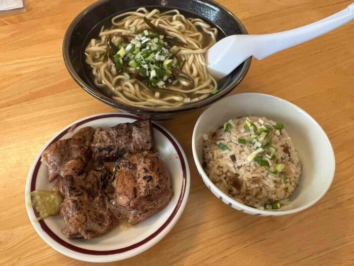 今回注文したのは炙り軟骨ソーキそばとジューシーです。