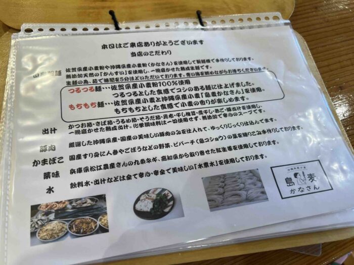 沖縄県産小麦「島麦かなさん」と佐賀県産の小麦を独自にブレンドして自家製麺をお店で手作りしており、「つるつる麺」「もちもち麺」の2種類から麺の種類を選ぶことができます。