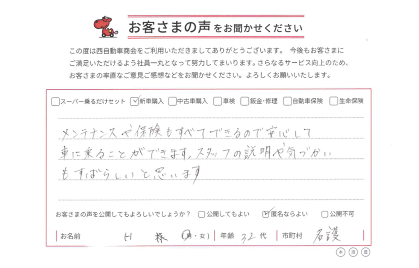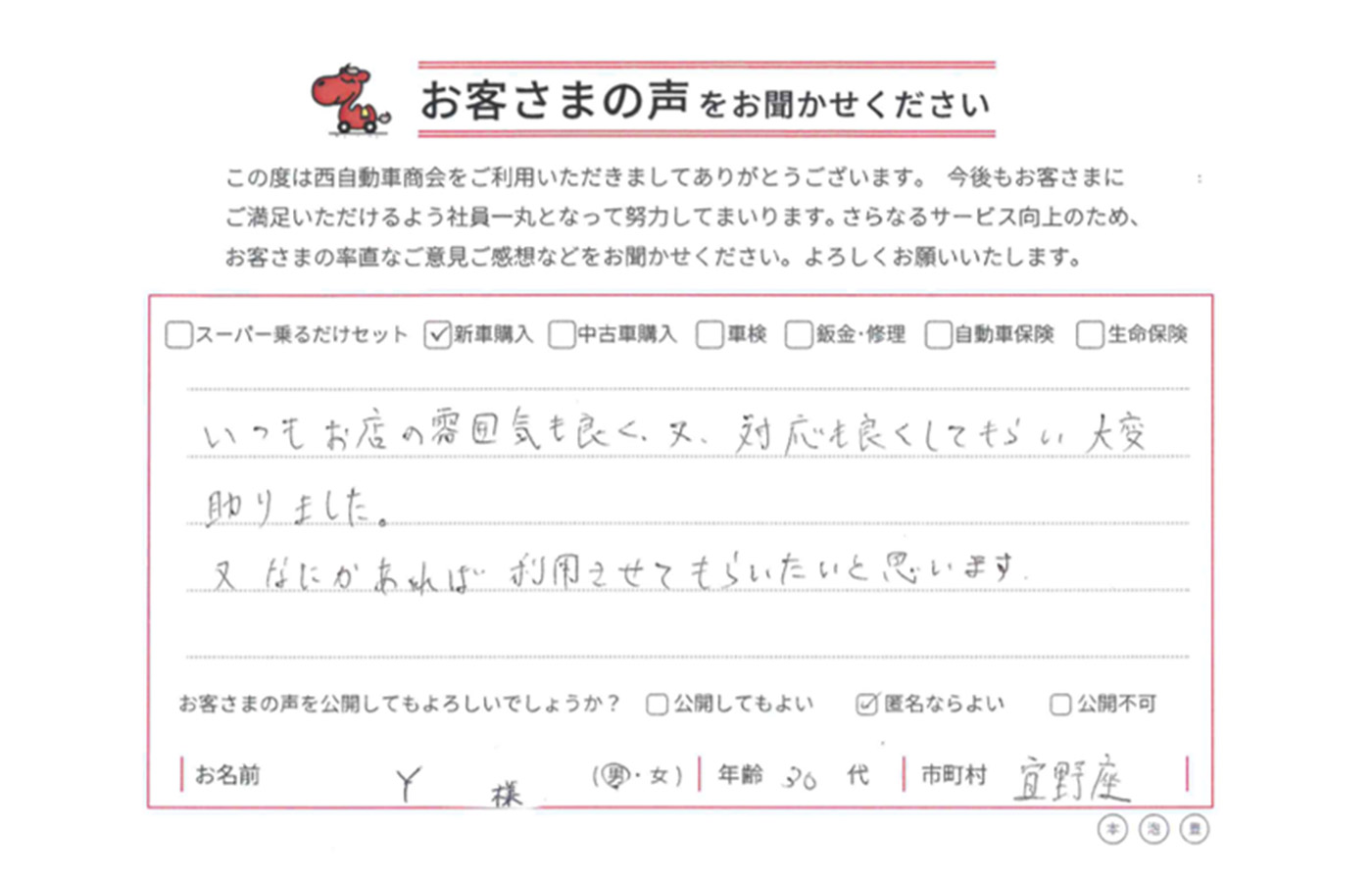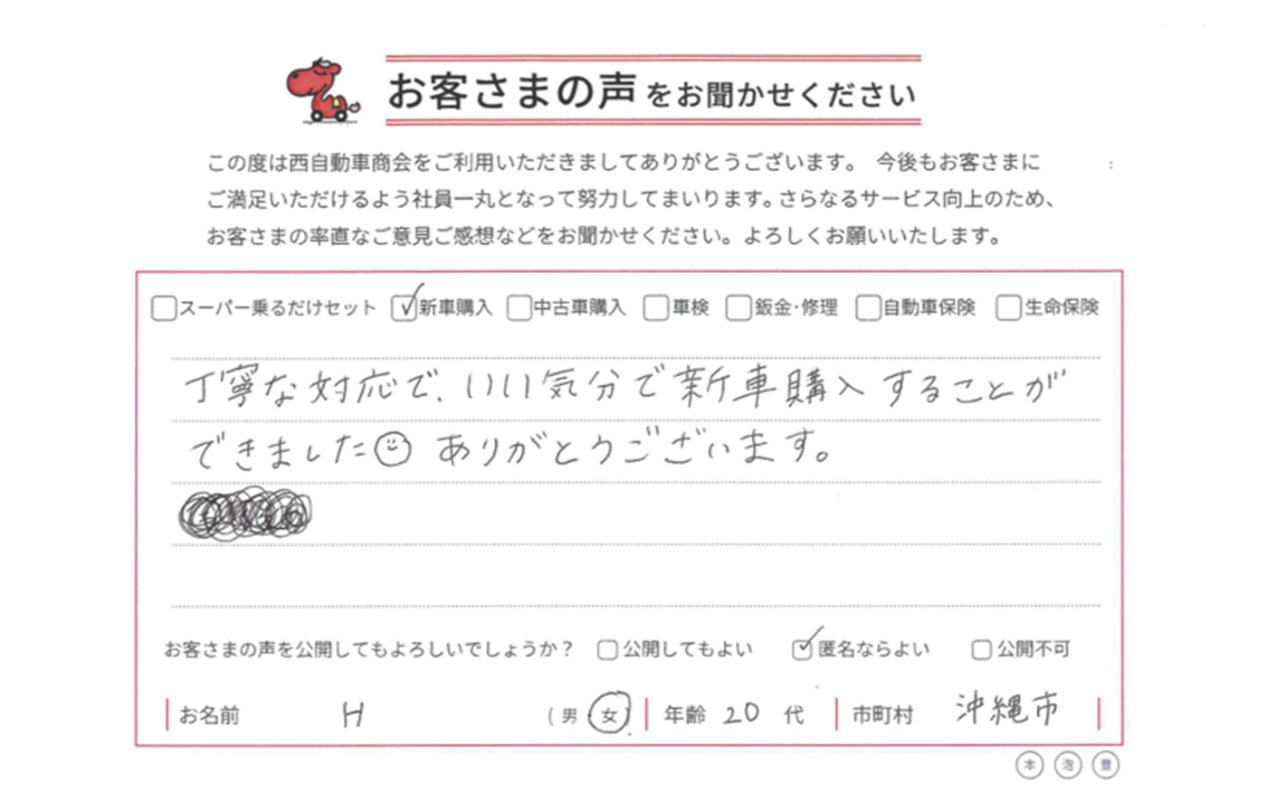 丁寧な対応で、いい気分で新車購入する事ができました。ありがとうございます。