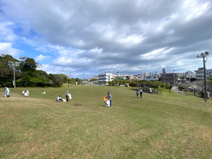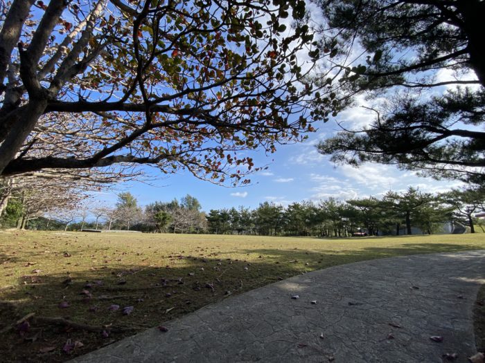 安慶名中央公園にクルマをとめて、まず中央広場(原っぱ)へ向かいます。