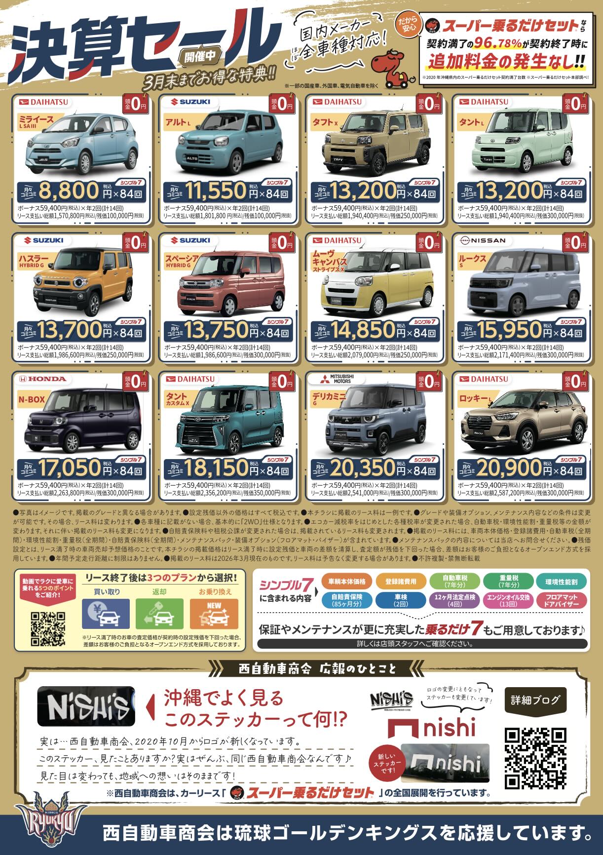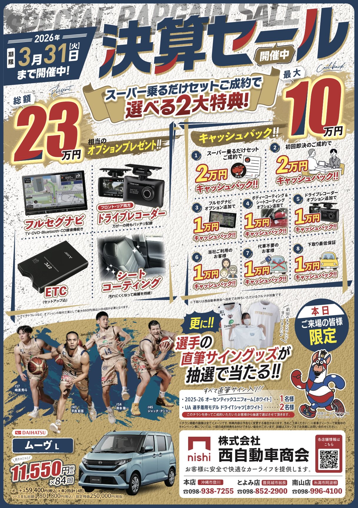 2026年3月31日までに西自動車商会の「スーパー乗るだけセット(カーリース)」をご成約いただいたお客様の中から、抽選で3名様に琉球ゴールデンキングス選手の直筆サイングッズをプレゼント!