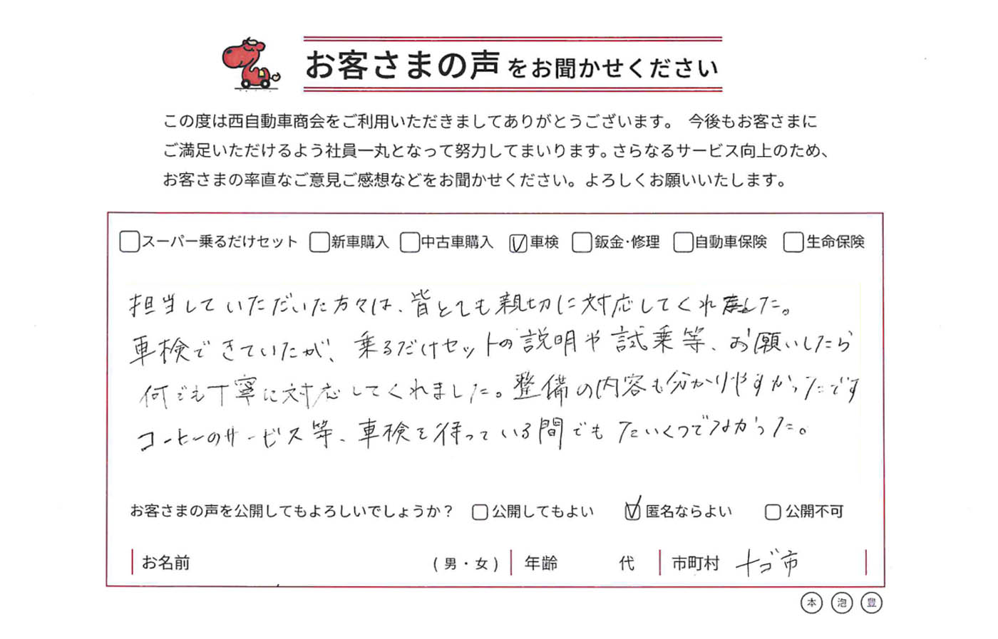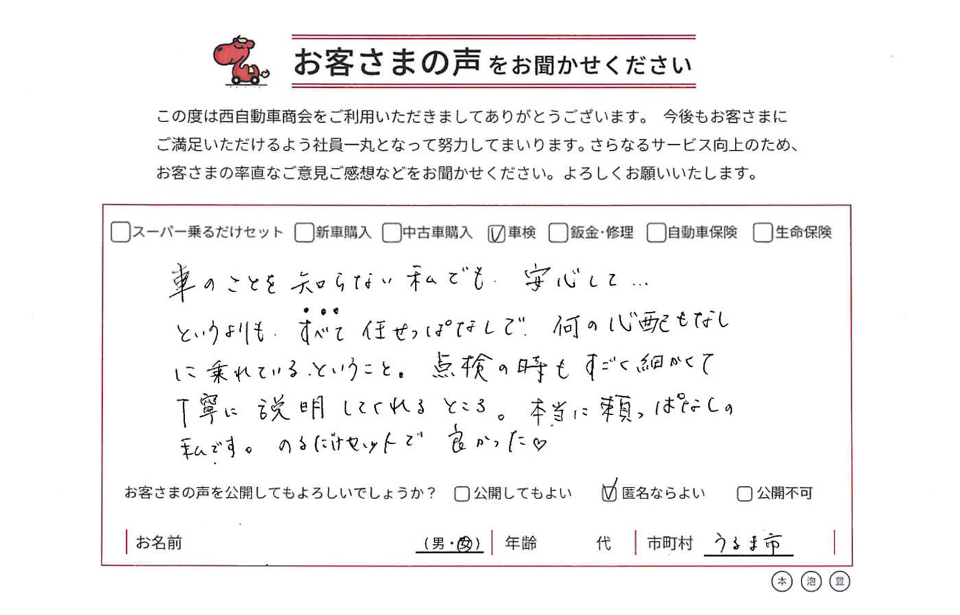 車検できていたが、乗るだけセットの説明や試乗等、お願いしたら何でも丁寧に対応してくれました。