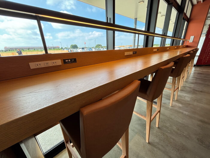 スタバ定番のフリーWi-Fiがあり、オープンと同時にカウンター席が埋まっていきました。ガラス面の向こうにはさえぎる建物もなく、すごーく気持ちよく作業ができそうです。